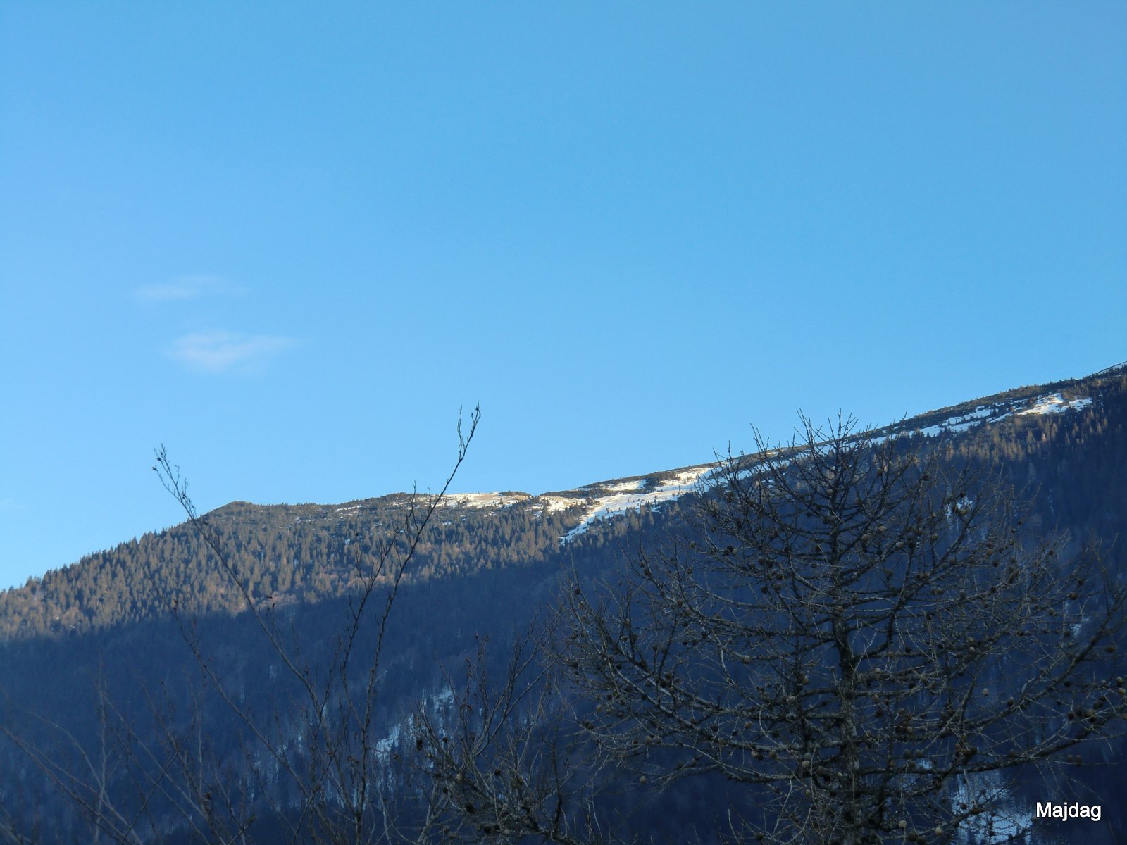 Pri drugem zavijem desno. Poleti je tam kar dobro vidna stezica. V snegu pa upaš, da je že kdo šel pred teboj. Bile so stopinje, sicer bolj po svoje. Pa vseeno je bolje kakor na celo. Kmalu se pokaže začetek skalnega grebena. Snega je kar nekaj. Previdno hodim saj sneg prekriva skale in veje, ki se ne vidijo. Hitro kaj zleti proti tebi ali stopiš v kakšno luknjo. Proti vrhu se sneg izgubi in le nekaj ledu je po grebenčku ob jeklenicah.