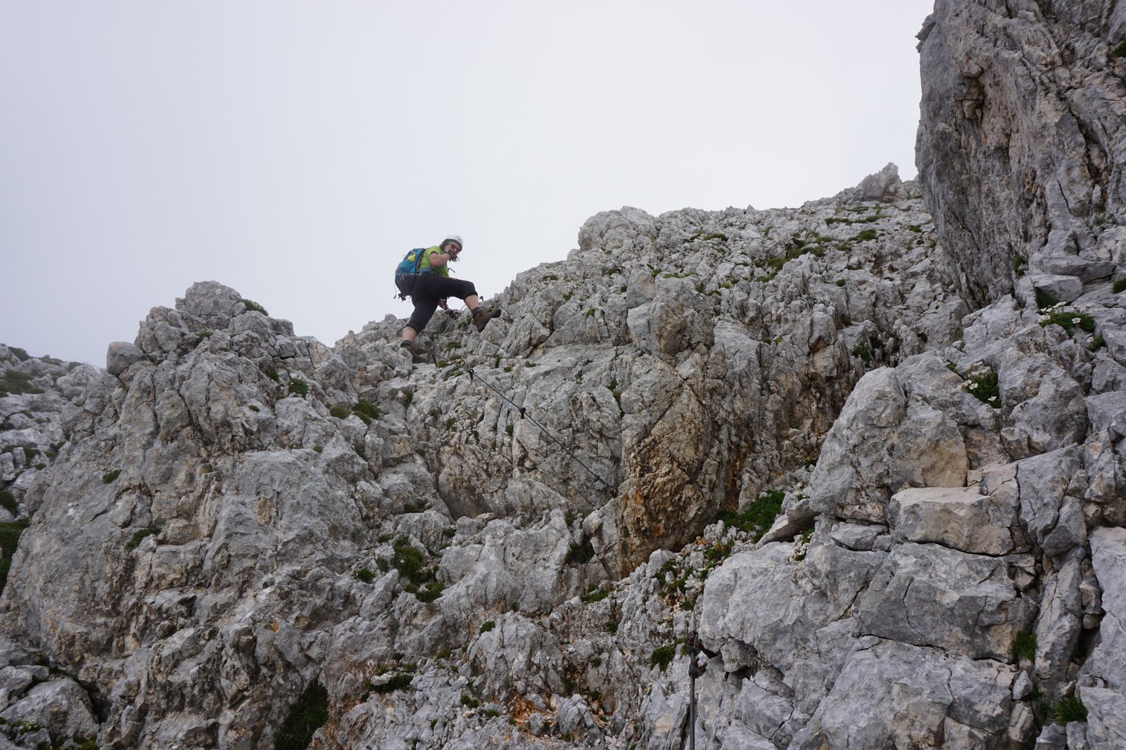 Najlažje je tam, kjer so jeklenice, potem se lahko primeš ali pripneš in se potegneš povsod. Manj kot polovica poti je varovana z njimi. Najtežji deli poti so, kjer ni ničesar, prehodi po ozkih poličkah, pod koraki pa pesek. Tam srce kar malo hitreje bije, vsaj meni. Sva pri zadnjem spustu, čez skobe. Počasi se spustim po njih, sestra je že spodaj.