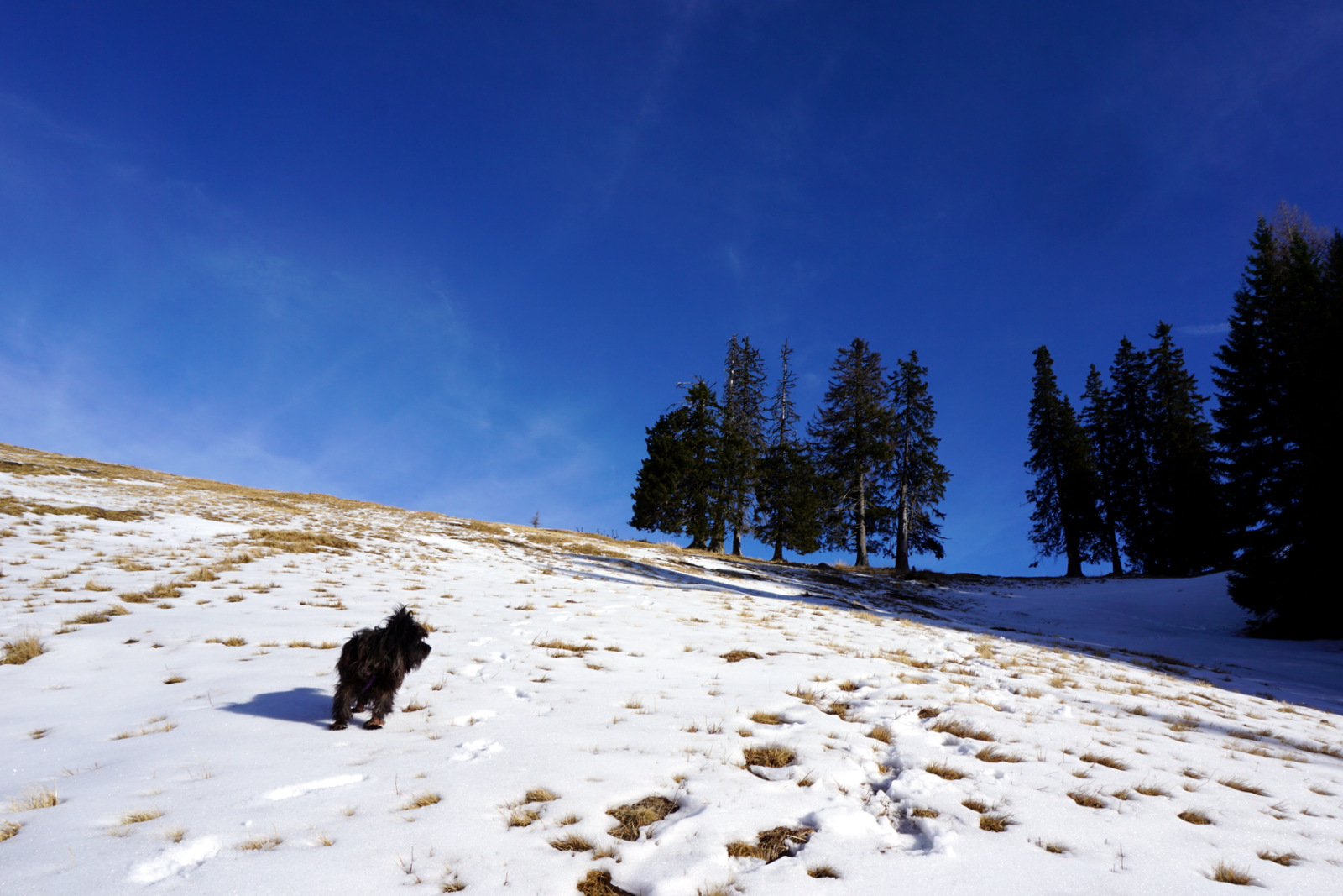 Snega je ravno prav, da prijetno škriplje pod koraki. Ko stopava po cesti se med drevjem kažejo Julijci od Kukove špice, Prisanka, Trentskega Pelca, Bavškega Grintavca, Mojstrovke, Jalovca do Mangarta.