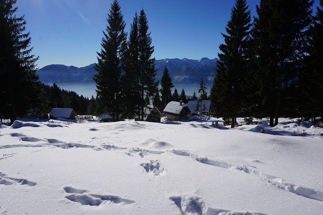Okoli osme je ura ko se z Marjano peljeva skozi Goreljek. Že dolgo se nisem peljala mimo Šport hotela na Pokljuki. Smreke so prekrite s pomrznjenim snegom, čudovit je pogled na hiše ob poti. Še malo po cesti in parkirava pri križišču s smerokazi.