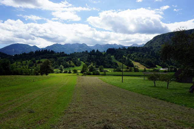 Narediva si postanek in kratek prigrizek. Potem se spustiva po oznakah, proti Gorjušam. Ne moreva mimo, ustavljava se, prve hiše in čudovita pokrajina.