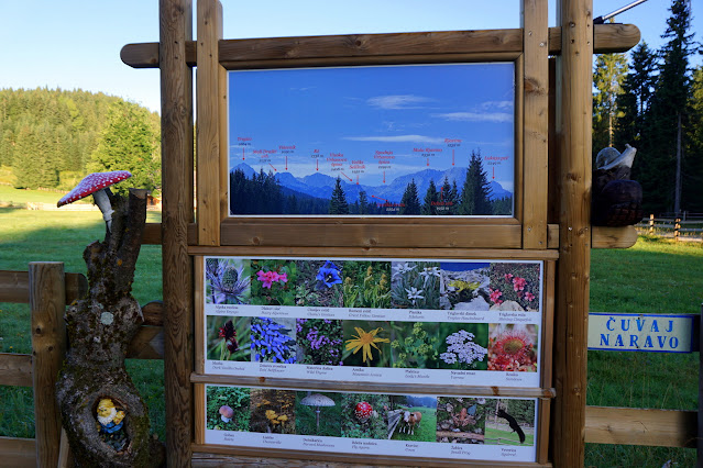 Tu mi je potka poznana. Še za hišo in mimo zadnje hiške in kratek vzpon in sva pri razgledniku.
