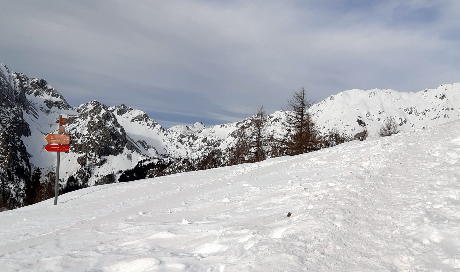 Potka je dobro uhojena, snega je veliko, je pa strma. Še sonček ujamem v daljavi, ko oznanja nov dan.