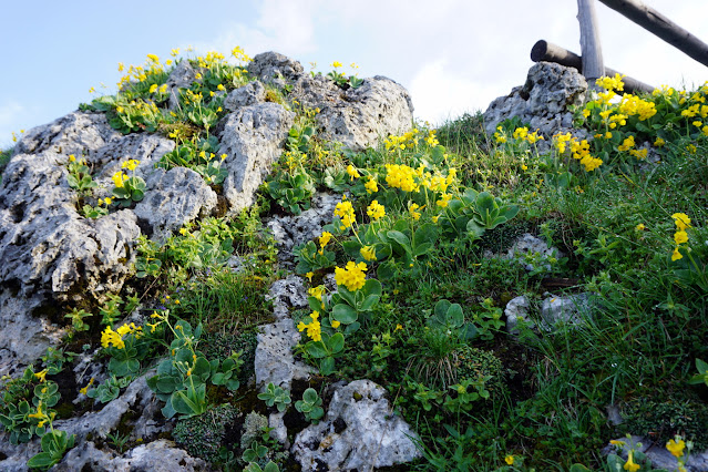 Pa zopet zakrije pokrajino sivina. Bližam se koči. Skale so prekrite z rumenim cvetjem. Avriklji cvetijo. Zdi se mi, da jih je manj kakor ob zadnjem obisku. Za dušo in srce pomirit jih je dovolj. Meglice so danes glavne. Veter se trudi na vse pretege, pa so hitro nazaj. Aparat držim kar v roki, če hočem ujeti kakšen moder utrinek neba in kakšne razglede.