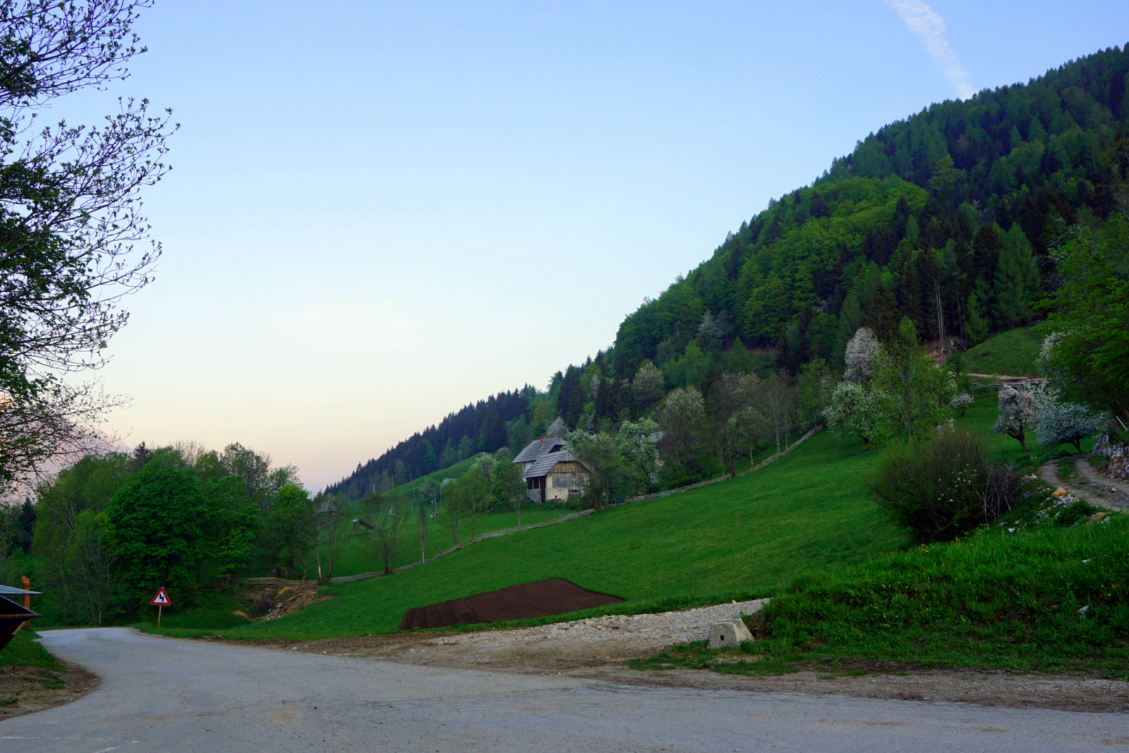 Še malo po cesti in spust po strmini. Je občutno bolj strma kot jutranja. Že na pogled je huda.