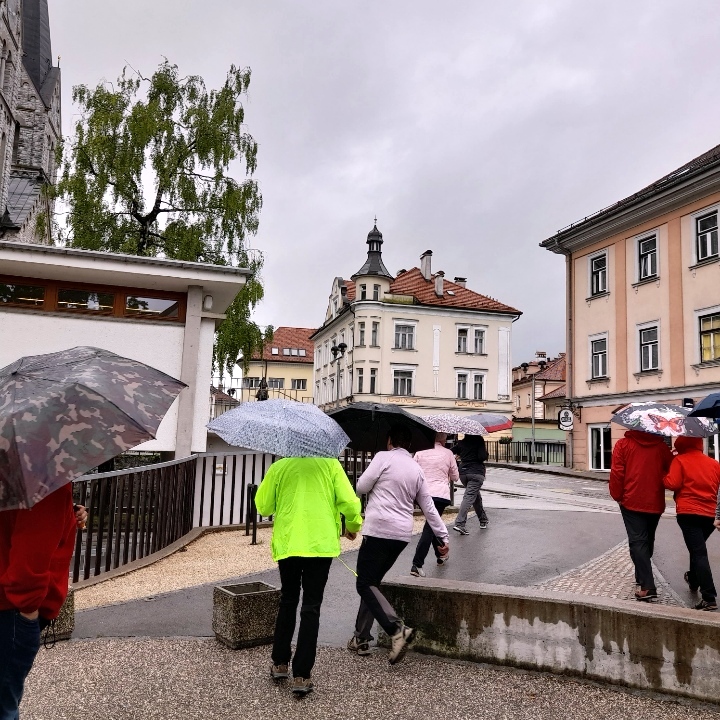 Ob kofetku je razlaga še bolj zanimiva. Potem se naša četica odpravi na ogled Kočevja, z dežniki, vetrovkami ali brez. Zanimivo, bolje je hoditi kot sedeti. Še mimo parka gremo, kjer so posneli pesem, "Sam po parku se sprehajam, Gugu."