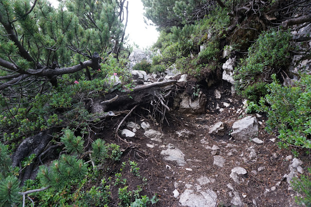 Škoda, da ni daljši greben. Nadaljujem, včasih je treba malo pogledati tudi stezico. Izgubiti se ne moreš. Tudi skozi ruševje te zapelje pa ni prehoda in se vrneš nazaj. To se dogaja le prvič, potem že veš kam je treba usmeriti korak.