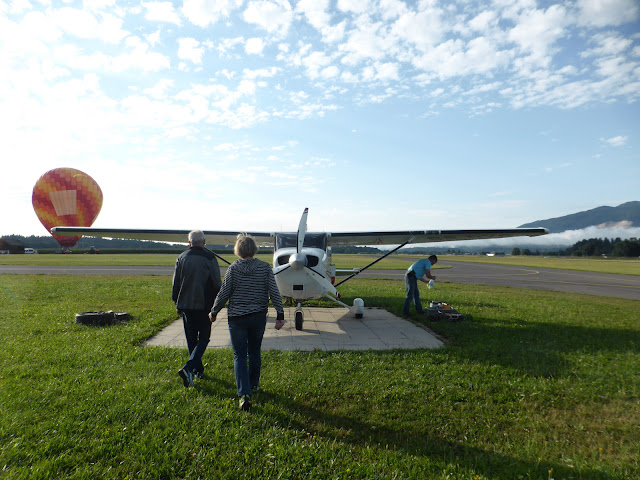 Krasno jutro in krasen polet se nam obeta. Ko začnem o nečem razmišljati moram to hitro narediti. Drugače me želja kmalu mine. Triglav se mi vedno bolj odmika in treba ga je videti. Če ne od spodaj gor pa od zgoraj dol. Mi je rekel zadnjič znanec z jutranjih sprehodov. " A že hodiš v višave gledat kako kaj zgleda tam zgoraj?" Pa se mu smejim. Kako izgleda tam zgoraj ne vem, vem pa da so poleti pod nebo nekaj čudovitega. Malo pobrskam in izvem vse potrebno. Hitro sem zmenjena in letališče je blizu. Le pri uri odhoda se malo zaplete, pa pilot Tone uredi, da prvi poletimo. Še Marjana in Milan gresta zraven. Sreča in veselje je v družbi lepša, pa še debata dalj traja. Vedno pridem prej kot je dogovorjeno in rajši čakam, kot hitim. Malo se sprehodimo po letališču, je zanimivo. Veliko letal imajo in meglice se vijejo pod Jelovico.